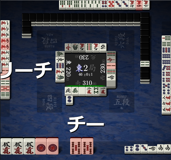 赤が1枚で打点的にそんなに不満はないですが、トップ目でのカンチャンリーチという