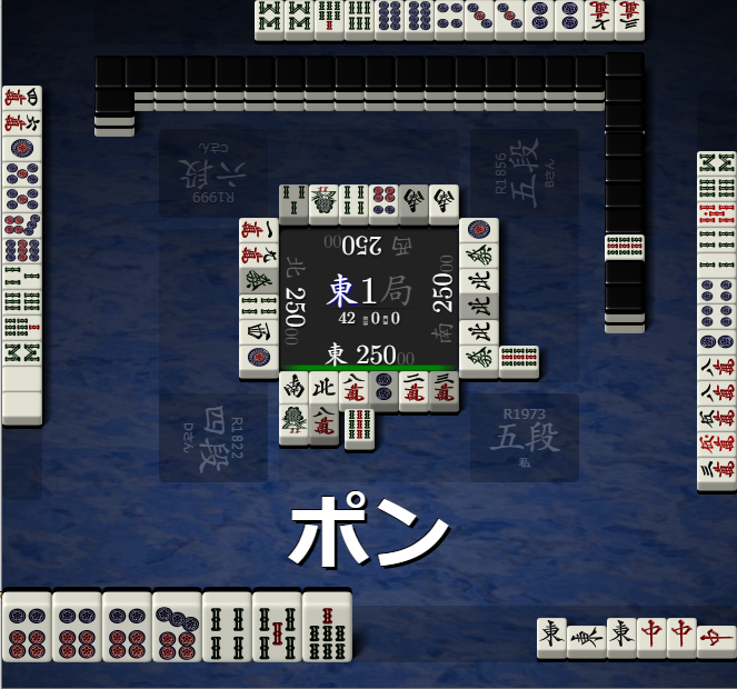 東、中を鳴いて相手も警戒してくるので、テンパイ時にアガりやすい形を残すことも
